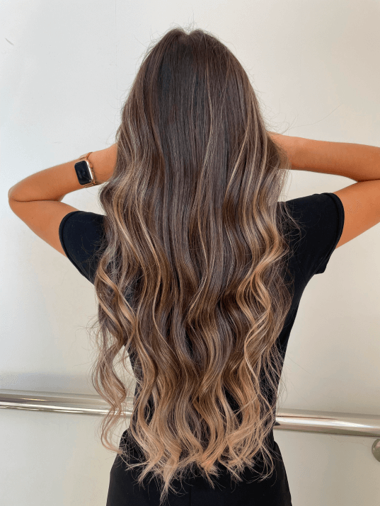 Os cabelos longos são uma tela perfeita para a Morena Iluminada Doce de Leite. Combinando tons quentes e suaves, essa técnica adiciona luminosidade e profundidade a cada mecha, criando um efeito de movimento que enche os cabelos longos de vida e vitalidade.
